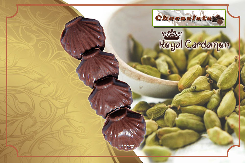 (Cardamom seeds mixed with tempered milk chocolate.)
